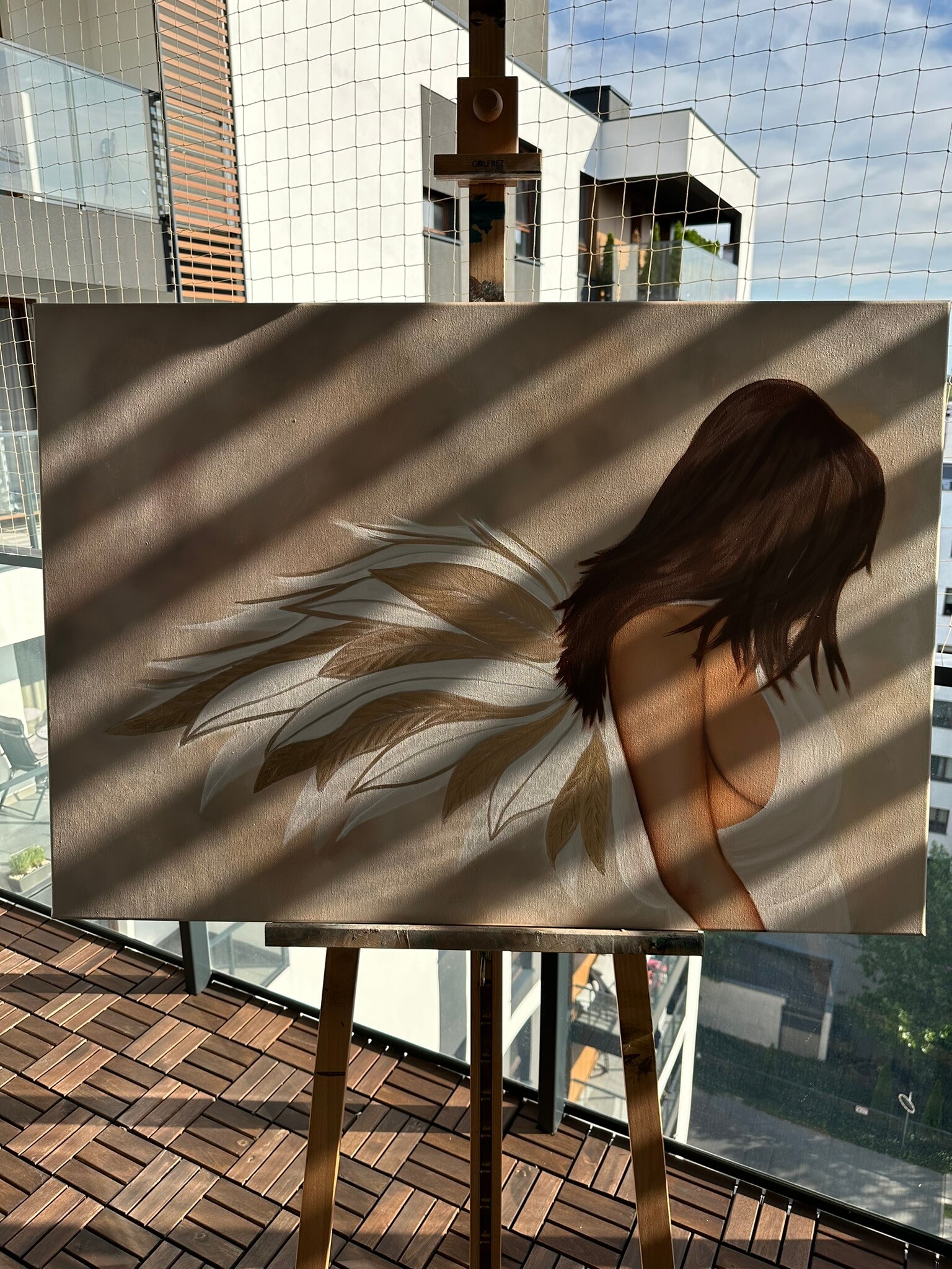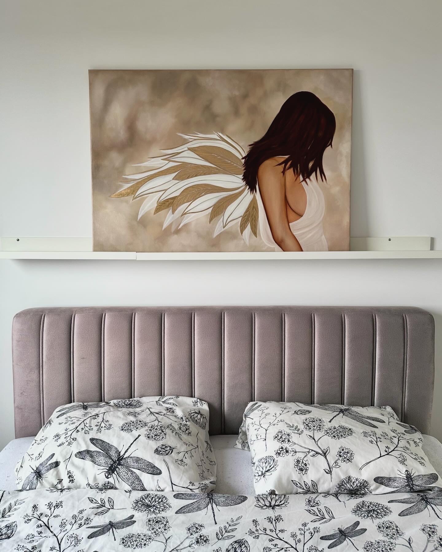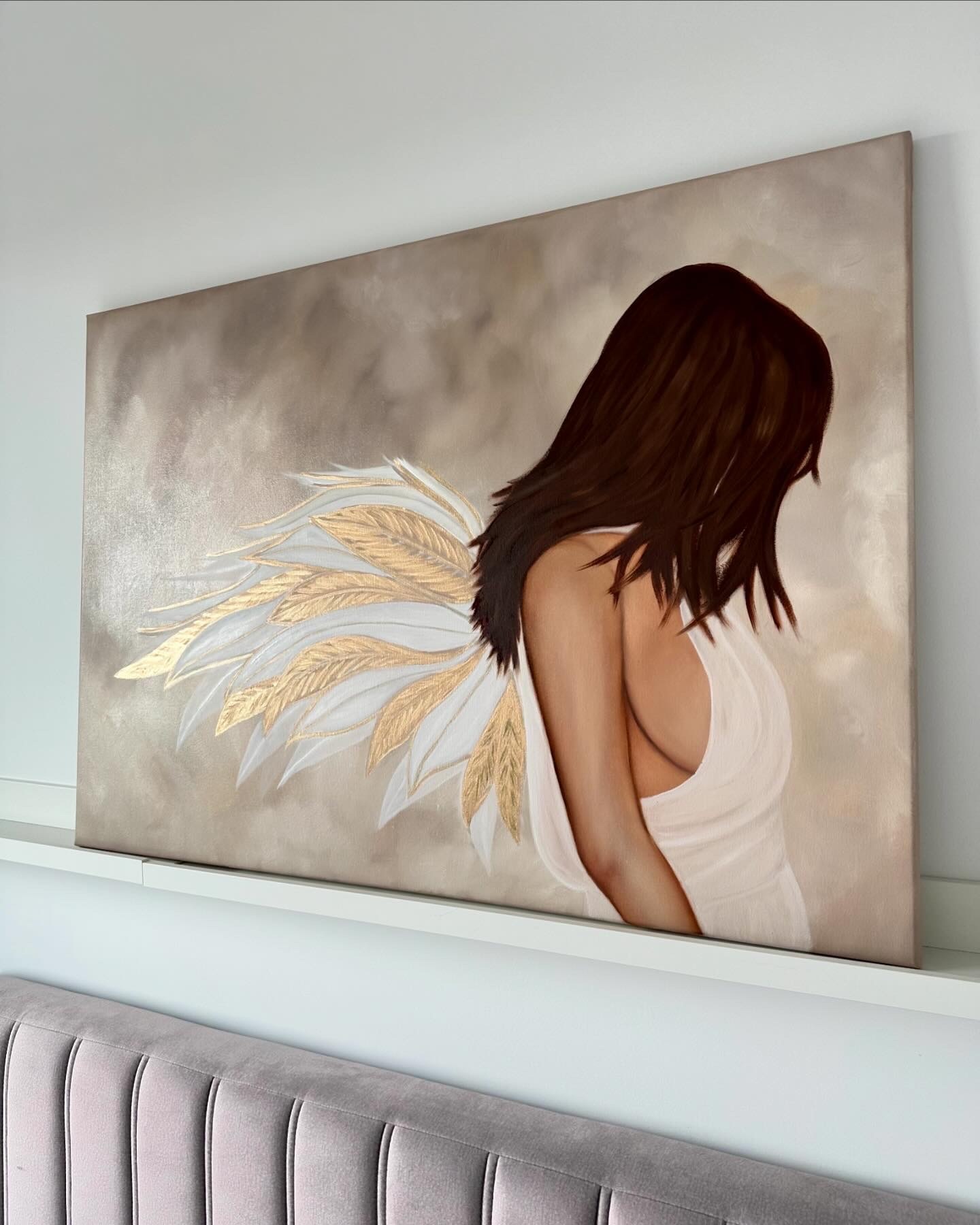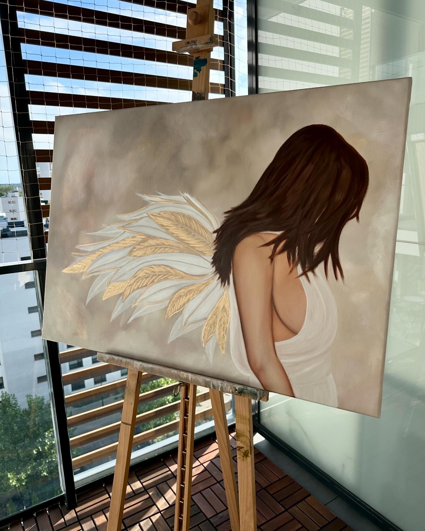 Złote skrzydła anioła lśnią ciepłym blaskiem. Jasna, niemal eteryczna szata otula jego sylwetkę podkreślając jego nieziemską naturę. Cała postać emanuje ciepłem i bliskością, przyciągając wzrok i budząc uczucie spokoju.